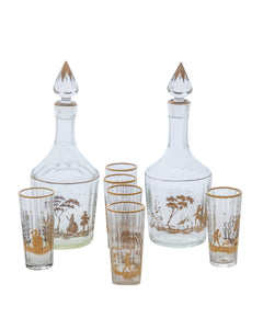 Ensemble de deux bouteilles et six verres en cristal cannelés peints à la main