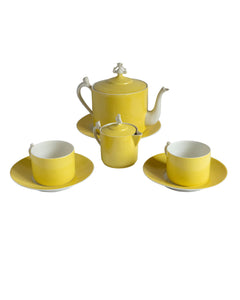 Service à café en porcelaine jaune et blanche avec détails sur les anses