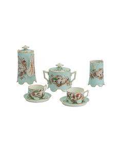 Ensemble de thé Art Nouveau bleu ciel et or avec finition en forme de vague et représentations de différentes scènes