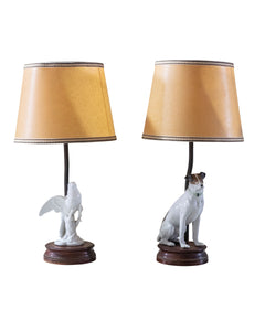 Paire de lampes en porcelaine "chien et oiseau" sur socle en bois