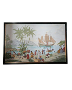 Toile peinte à l'huile représentant une scène commerciale dans les Antilles. XXème siècle. S. Hubert