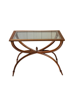 Table auxiliaire en bois sculpté et plateau en verre avec pieds circulaires. Début du XXème siècle