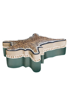 Ottoman tapissé avec une peau de léopard brodée en laine 100% (Bleu Pétrole)