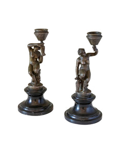 Paire de bougeoirs en bronze soutenus par des femmes nues et socle en bois