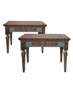 Couple de consoles en bois polychromé, sculpté et doré avec dessus en stuc peint. Espagne. Première moitié du XIXème siècle