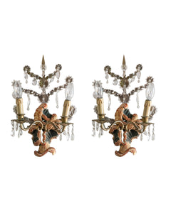 Paire d'appliques en bois polychrome et cristal. Italie. XVIIIème siècle
