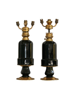 Couple de lampes de table fabriquées en opaline noire avec trois porte-lumières. Fin du XIXème siècle