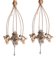 Paire de bougeoirs suspendus avec structure en fer, base en bois polychromé et coeur en verre