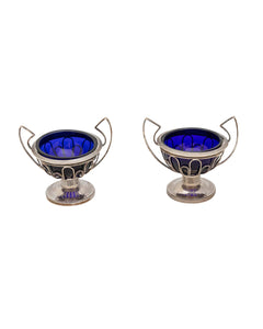 Paire de salières composées de verrines en verre bleu montées sur un socle en argent (Veilleard)