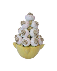 Centro de mesa en forma de almirez con ajos, en cerámica esmaltada de Manises. Siglo XX