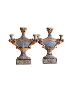 Pareja de copas de madera con pátina azul y dorada con base marmoleada